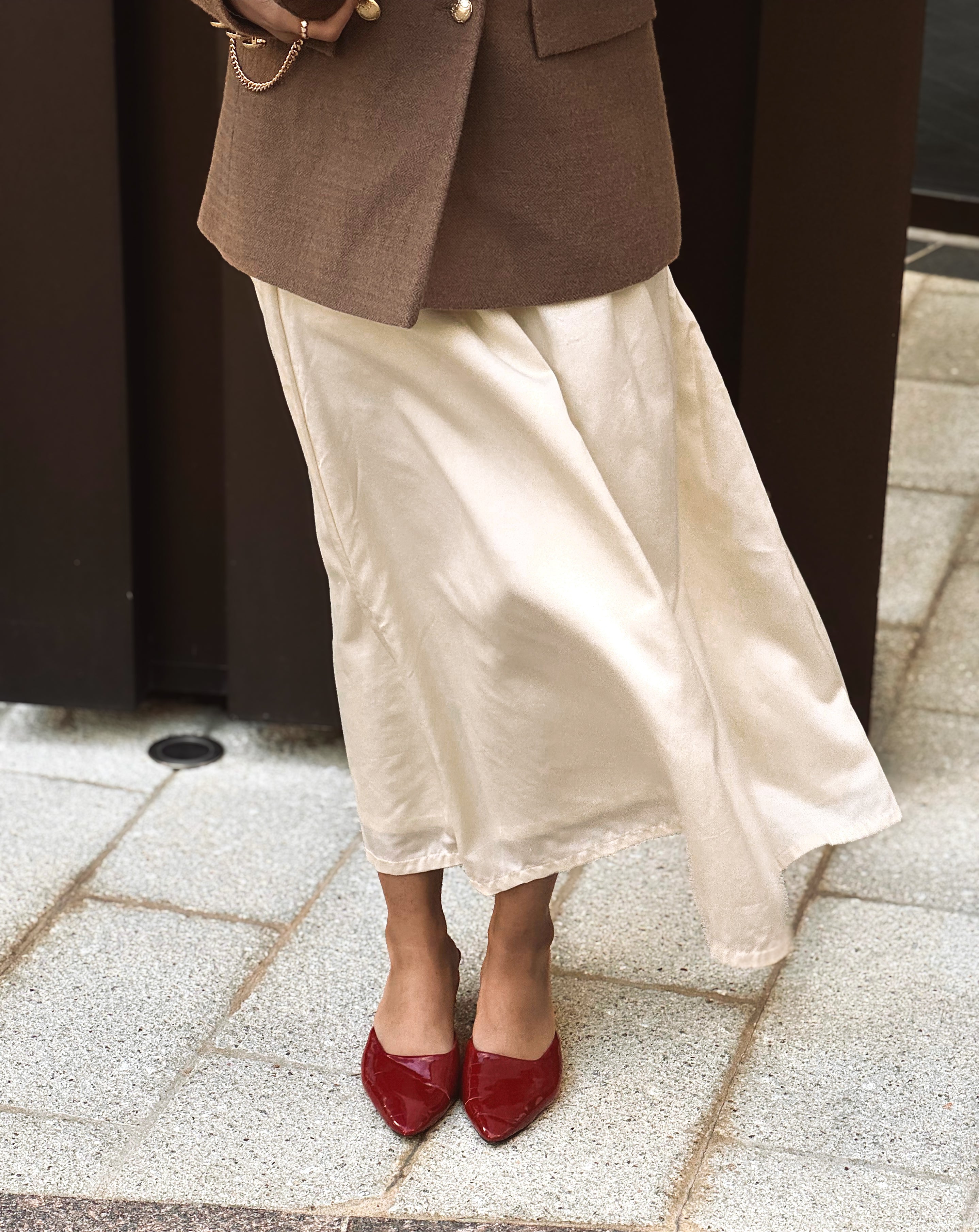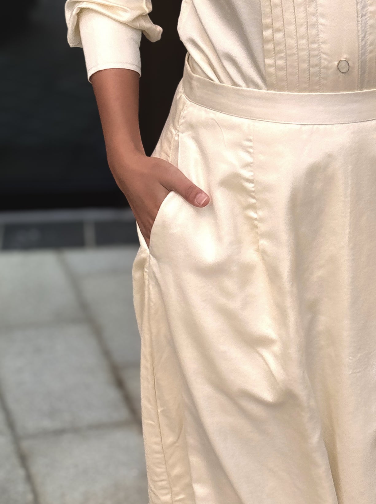 The Mulberry Silk Skirt flows with an effortless grace, designed in a timeless A-line silhouette that flatters every form. Crafted from Ahimsa mulberry silk in a smooth satin weave and lined with gajji silk, it offers an exquisite balance of softness, drape, and structure. A hidden pocket adds practicality, while a discreet side zipper secured with a wooden button completes the piece with a touch of natural charm. A statement of mindful luxury fluid, feminine, and consciously made.