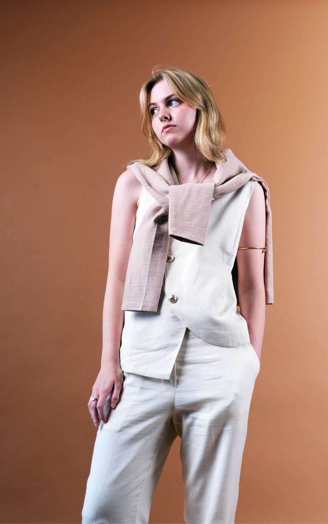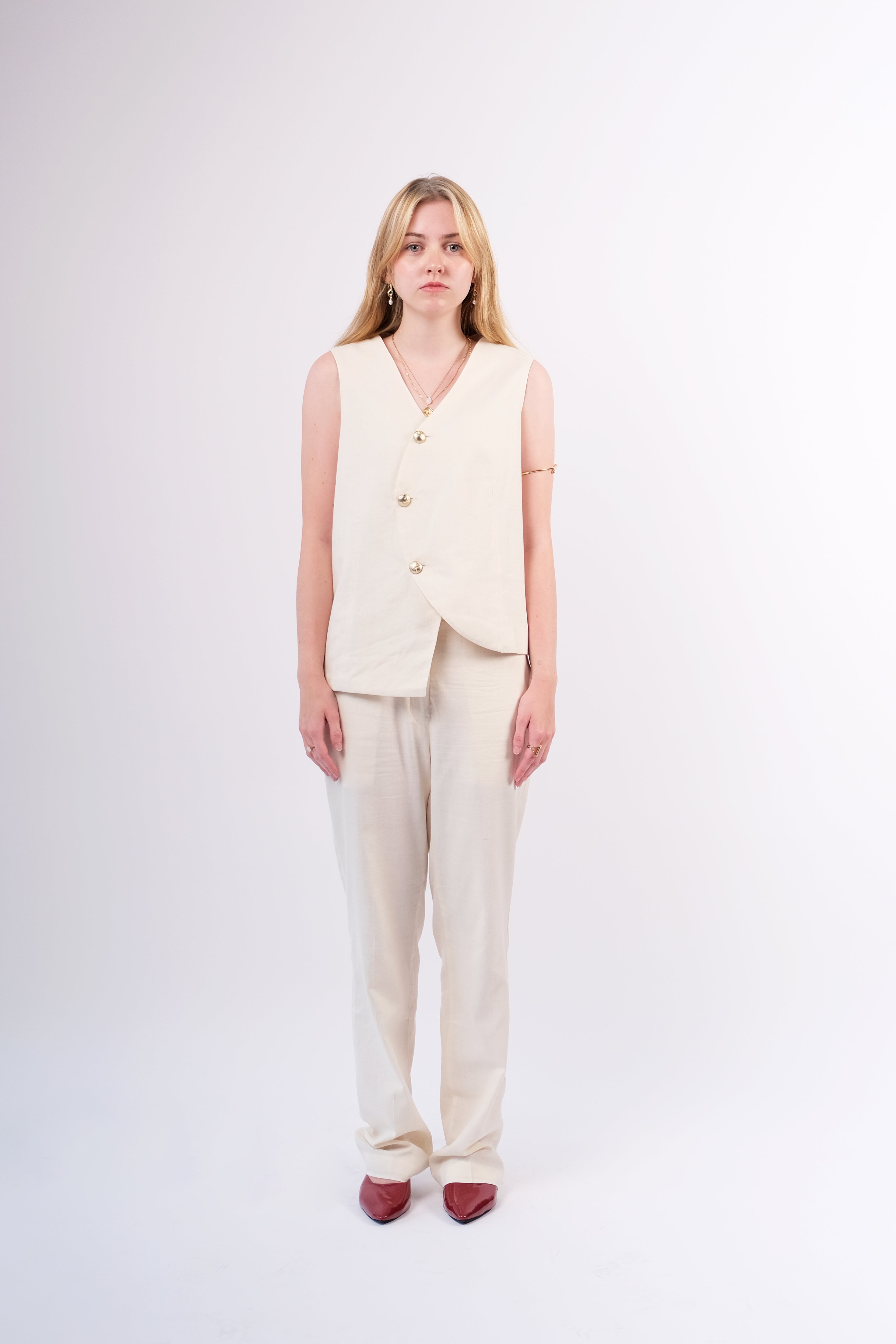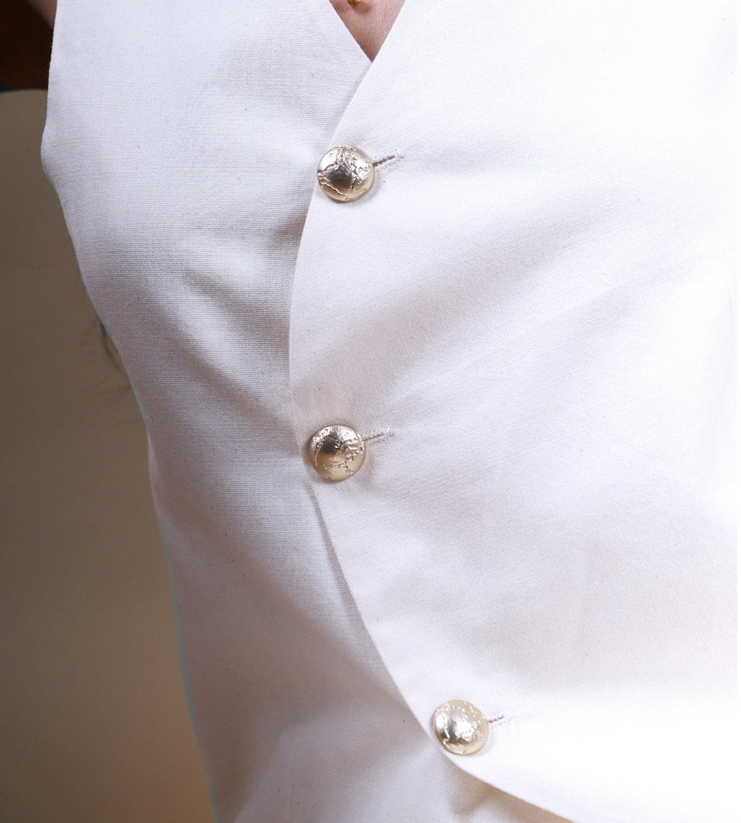 The Bamboo Cotton Vest is a refined essential crafted for contemporary elegance. Handwoven from breathable bamboo cotton and lined with soft cotton flex, it offers a naturally smooth texture and lightweight structure. The front features three recyclable metal buttons set in a curved asymmetric line, while the back includes two adjustable wooden buttons for a tailored fit. Minimal yet sophisticated, this vest blends modern tailoring with the purity of handcrafted fabric, an effortless piece that transitions seamlessly from day to evening.