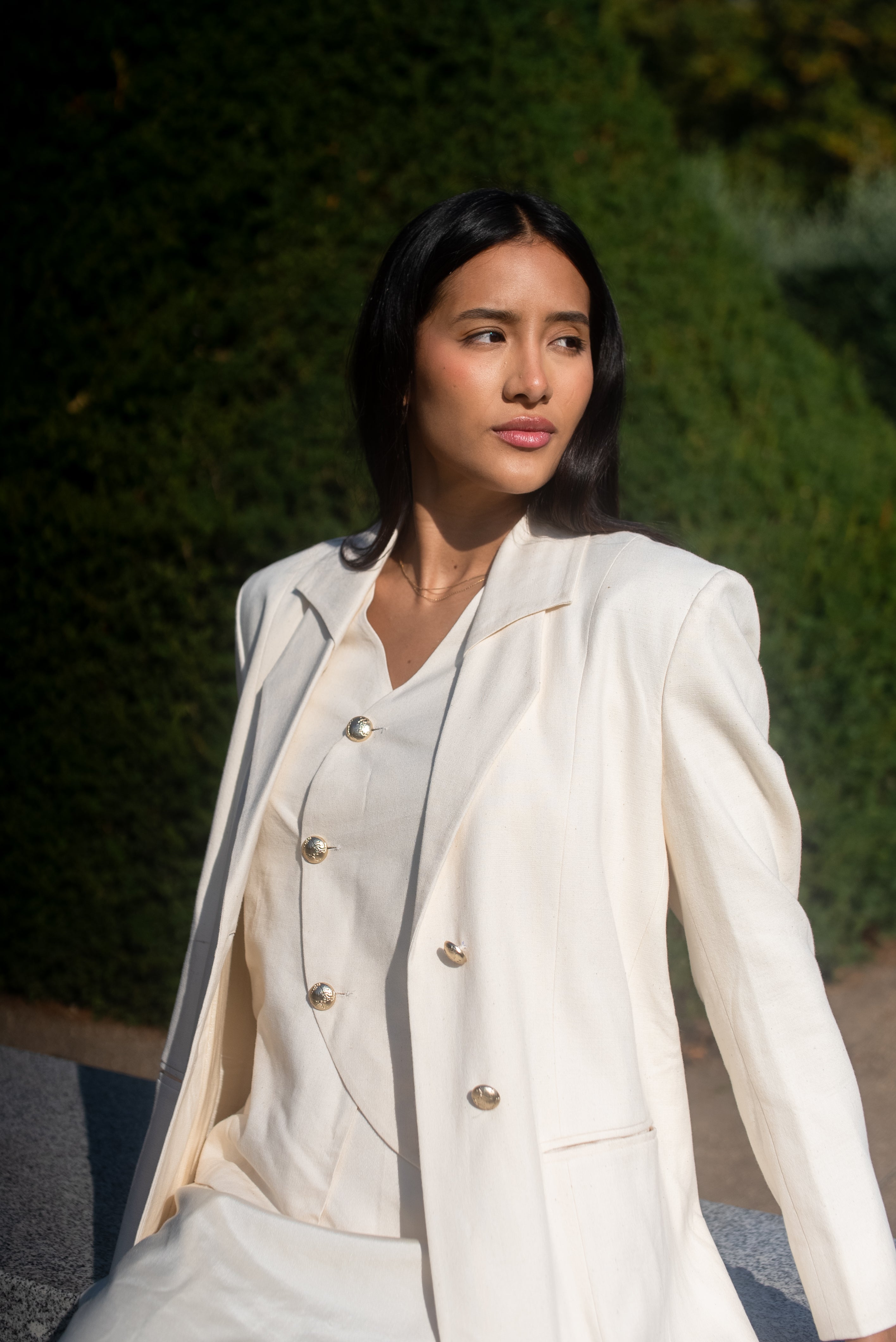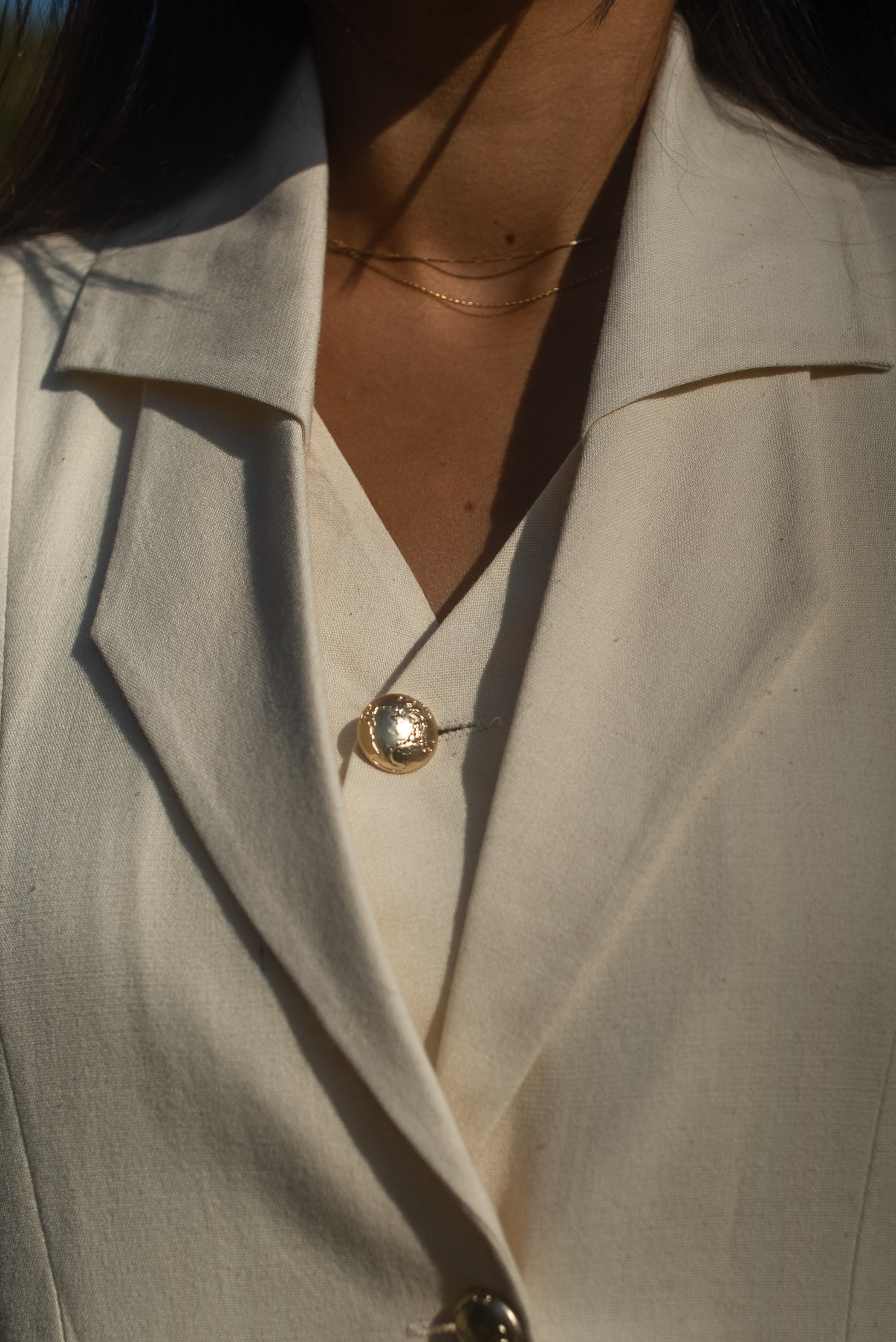 The Double-Collared Blazer redefines classic tailoring with a distinctive layered collar that subtly overlaps to create depth and dimension. Crafted from handwoven bamboo cotton and lined with lustrous gajji silk, it offers a naturally breathable structure with an elegant drape. Designed for a relaxed yet refined fit, the blazer features two recyclable metal buttons at the front and three matching buttons on each sleeve balancing modern craftsmanship with timeless sophistication. A seamless blend of comfort, innovation, and quiet luxury.