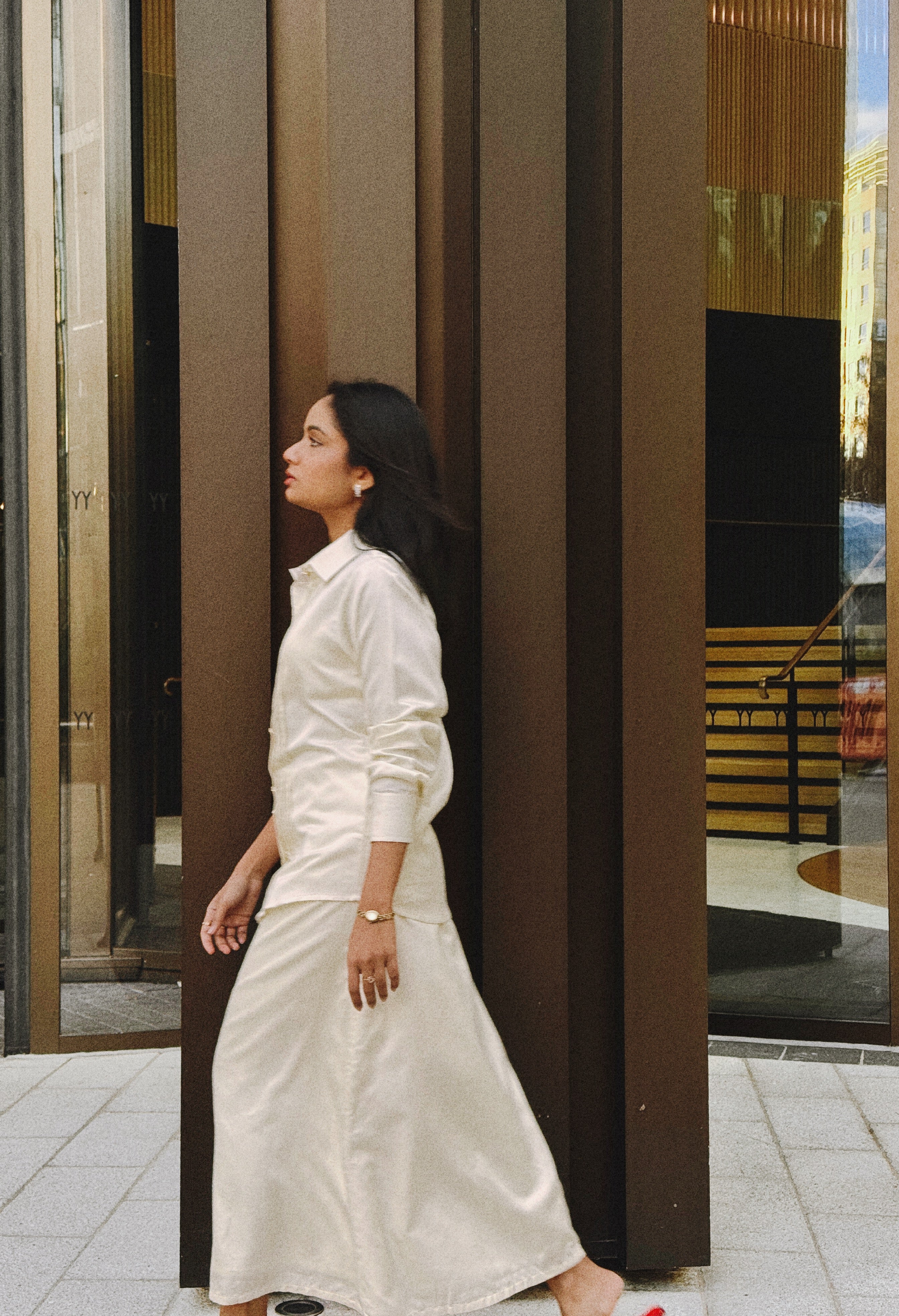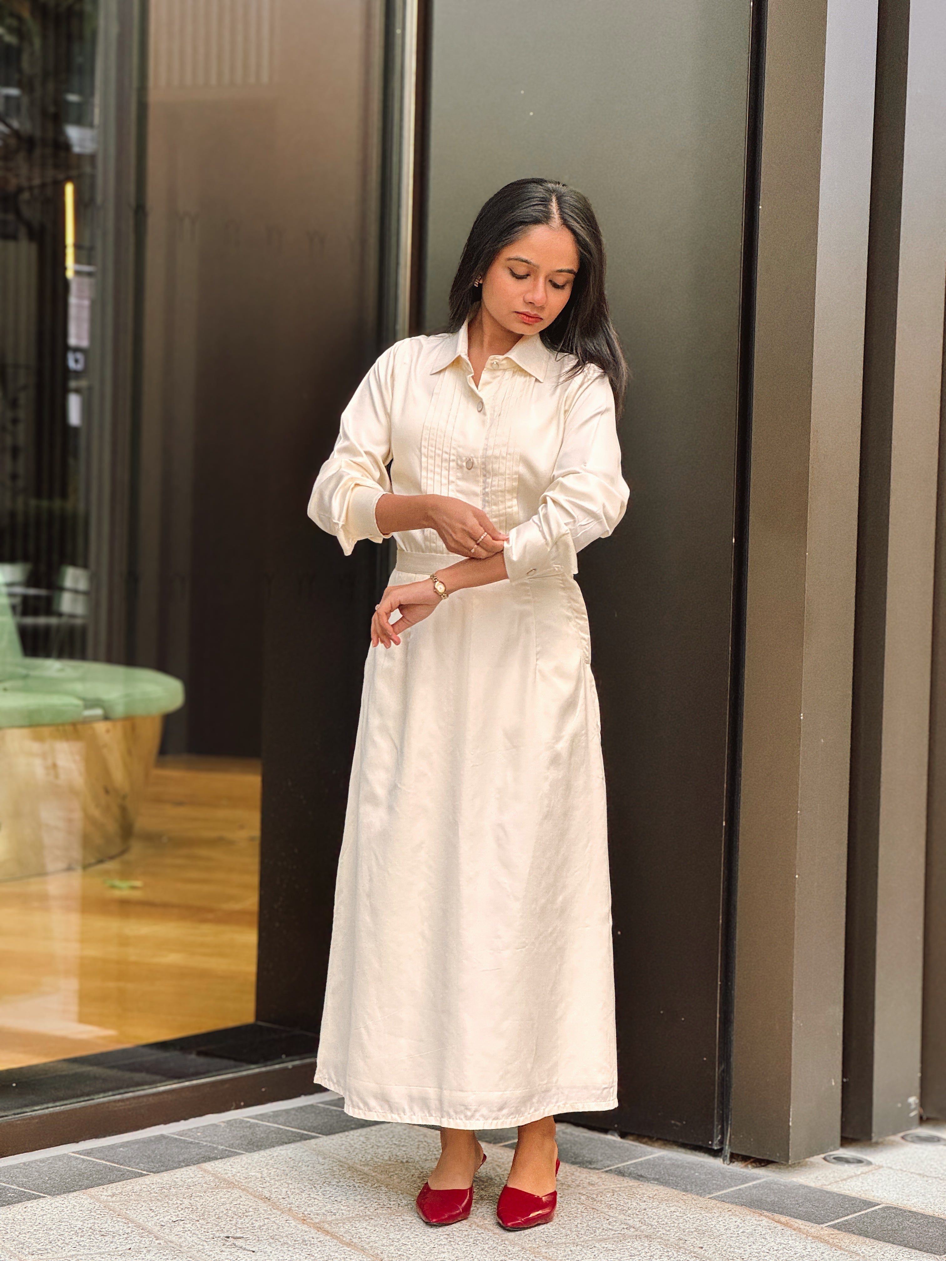 The Mulberry Shirt embodies quiet elegance through its fluid drape and refined construction. Crafted from ethically produced Ahimsa mulberry silk in a satin weave, it radiates a soft, natural sheen that catches light with every movement. Delicate front pleats add depth and structure, while metal buttons with a resin finish lend a subtle modern accent. A timeless wardrobe staple that pairs effortless grace with conscious luxury.