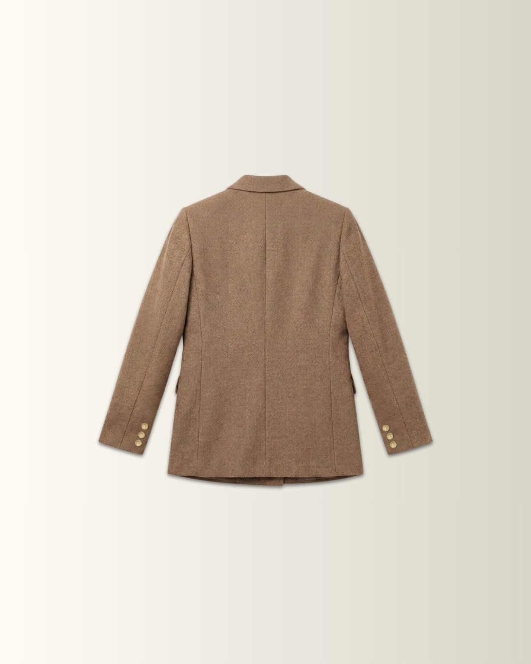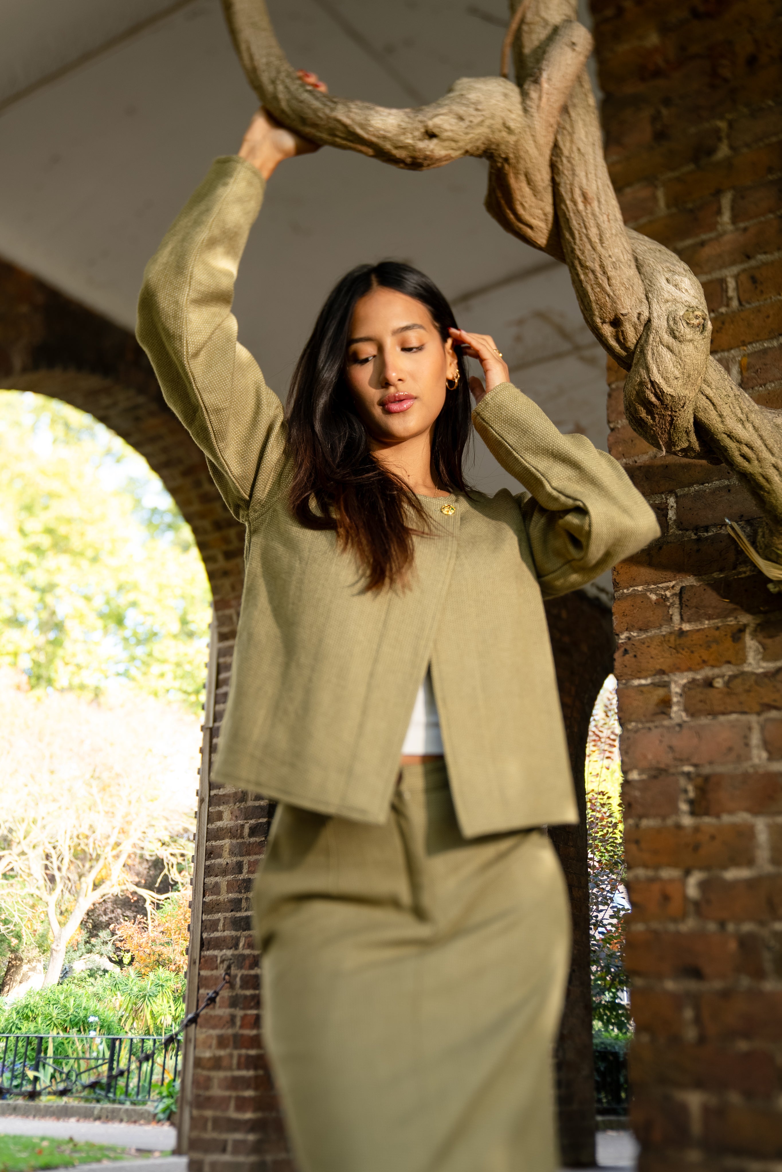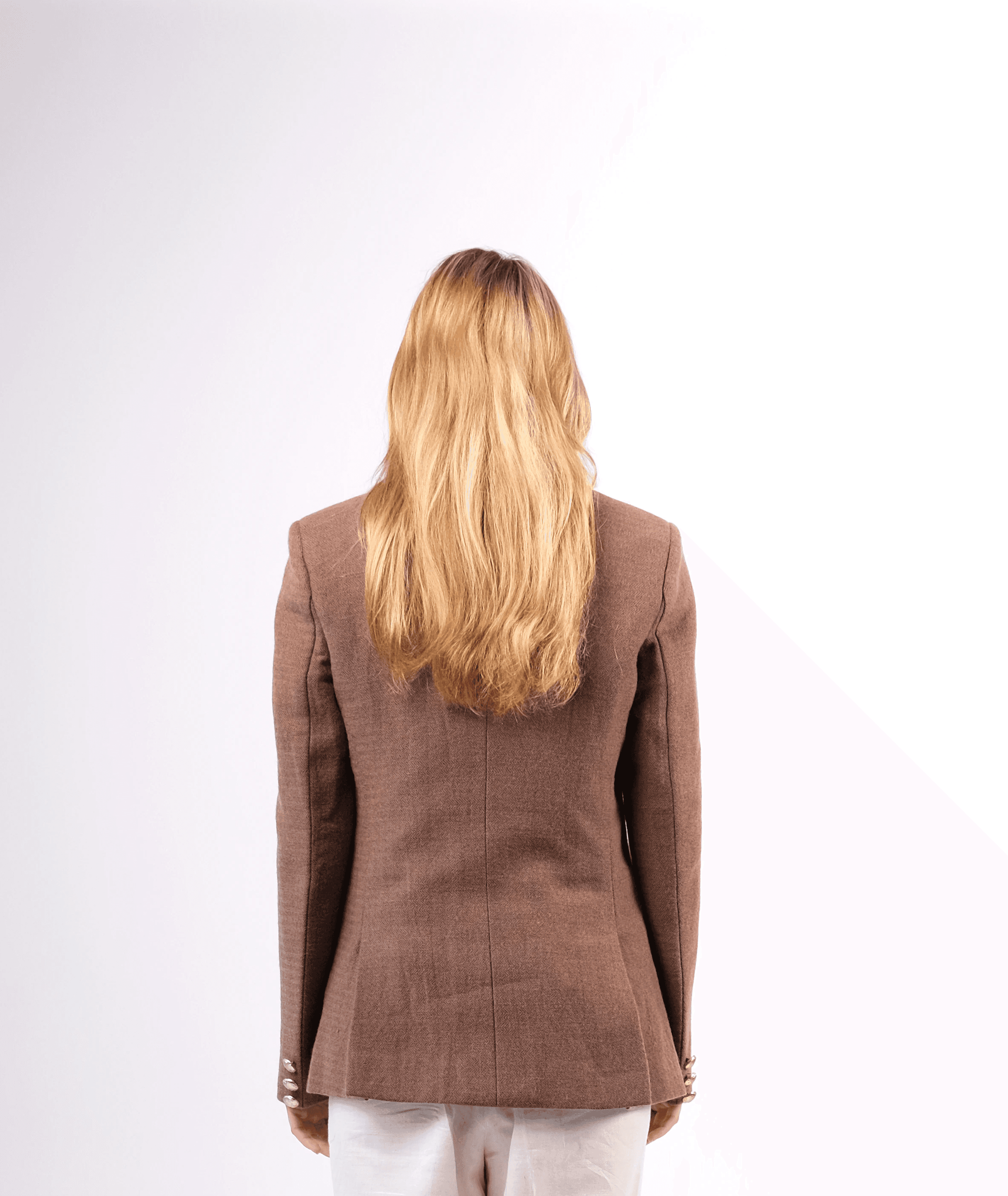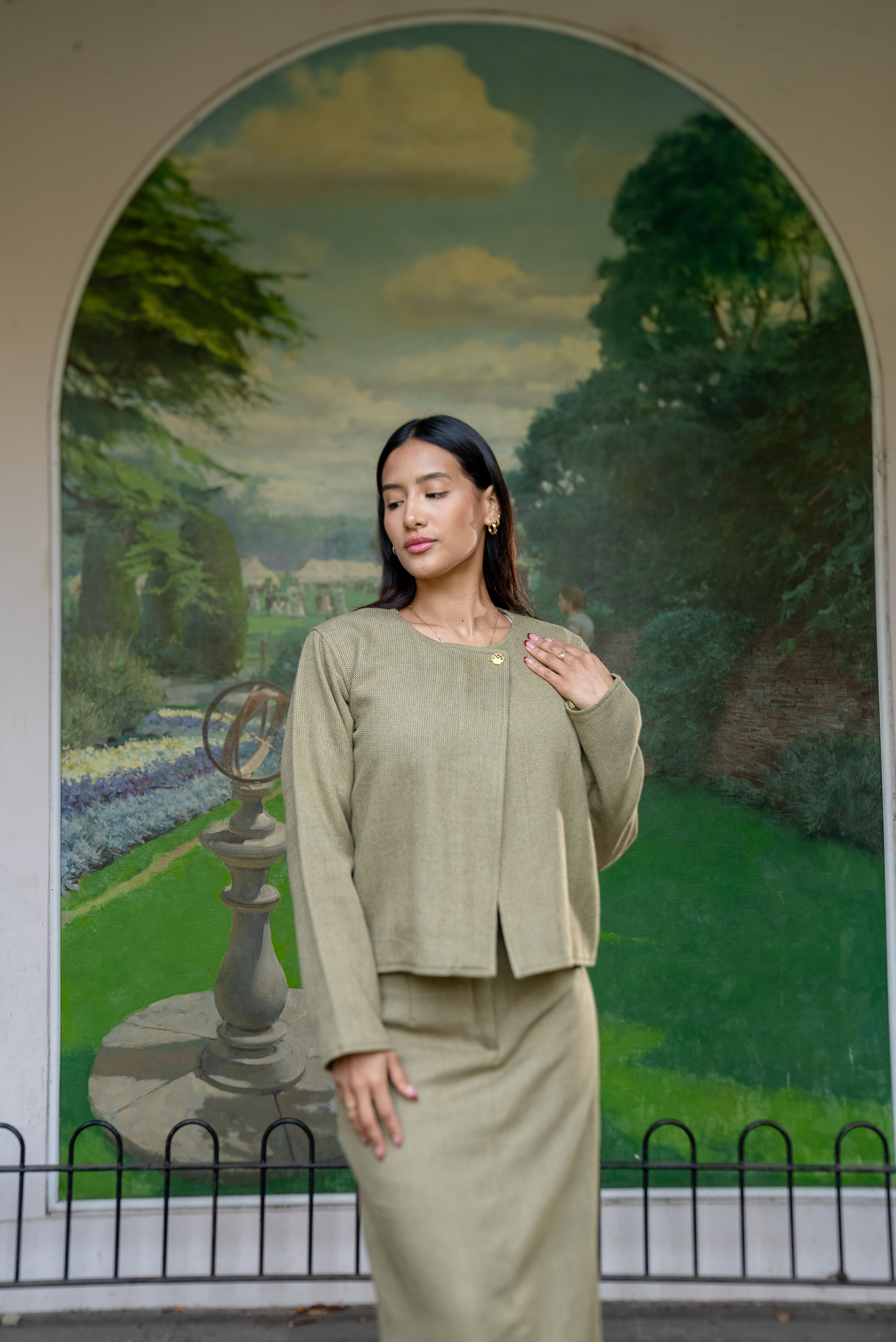 The Merino Wool Topper is a study in modern minimalism and tactile craftsmanship. Woven from fine Merino wool in a subtle tweed weave, it offers warmth without weight and a softly structured silhouette. Lined with smooth gajji silk for a gentle touch against the skin, the design features an asymmetric front secured by a single metal button and an invisible wooden button beneath, a quiet nod to functional artistry. A versatile outer layer that bridges elegance and ease.